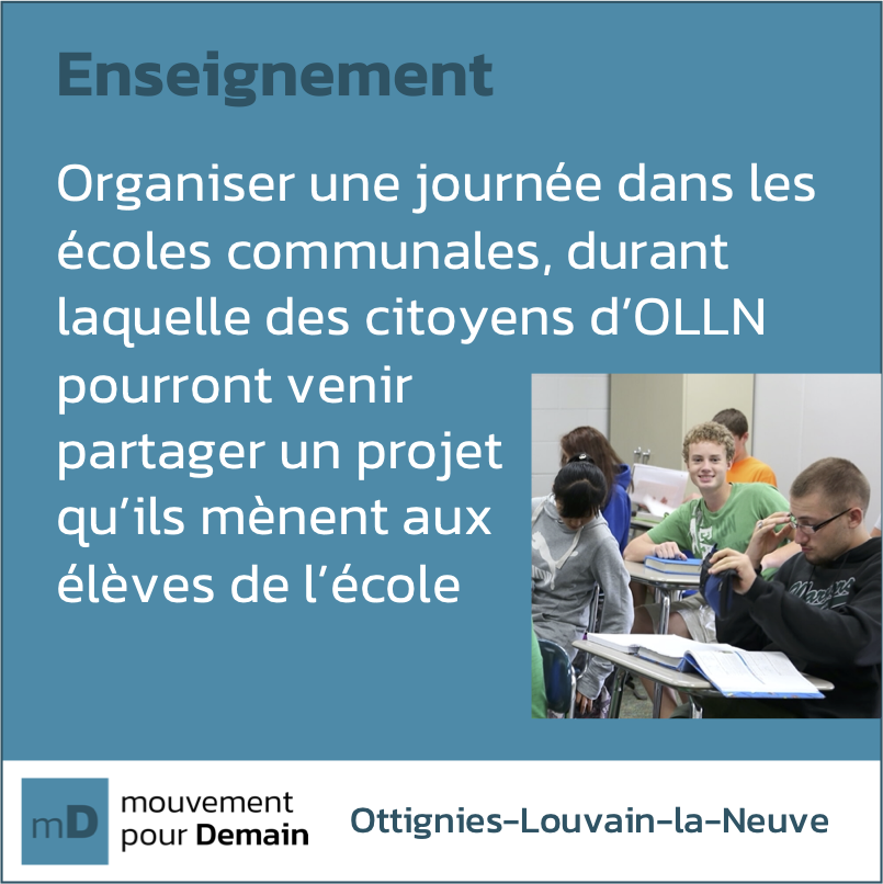 💯 L'un des projets imaginés pour notre Ville serait de permettre à ses citoyens, étudiants, actifs ou retraités, qui développent des activités et outils de les partager avec les élèves dans les écoles !