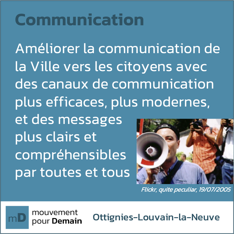 📣 Une communication efficace est cruciale pour informer les gens et garantir la transparence. Il faut améliorer les efforts faits par la Ville et renforcer les moyens de l'Administration communale pour une meilleure communication.