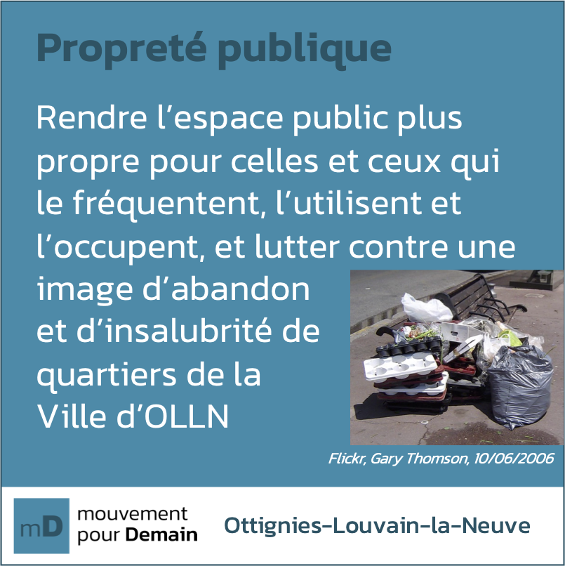 🌍 La Ville fait des efforts avec un Service Environnement relativement réactif, avec des collaborations avec l'ASBL BeWaPP mais il faut renforcer ces actions, mettre en place un Plan Local de Propreté (PLP) et améliorer les moyens de signalement des citoyens, premiers à subir les inconvénients.