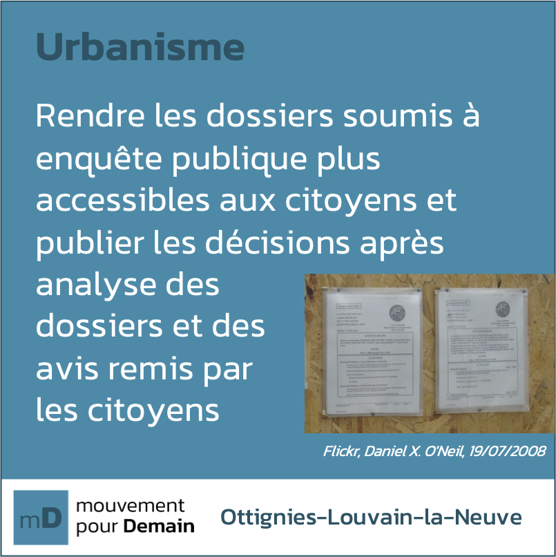 💭 Il est primordial de faciliter ce droit des citoyens, à répondre à une enquête publique ➡️ par un processus plus simple et clair, ➡️ par une meilleure accessibilité des dossiers (par exemple, par voie numérique systématique et permanence physique dans les bureaux de l'Administration à des heures pertinentes), ➡️ par une publication systématique des décisions au terme de la procédure.